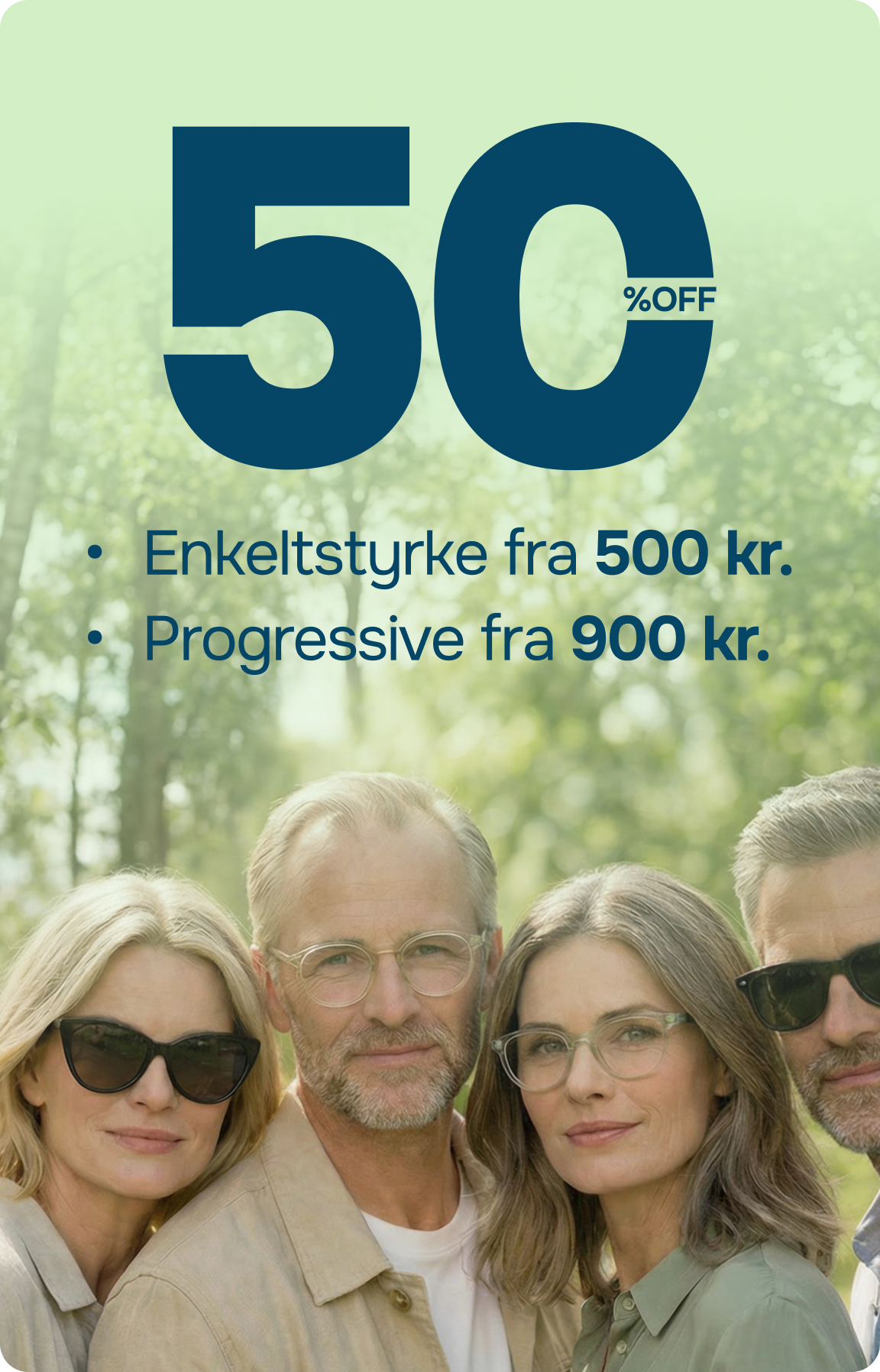 Vælg mellem enkeltstyrke, progressive eller solbrilleglas – med mulighed for 3, 5 eller 7 lags overfladebehandling